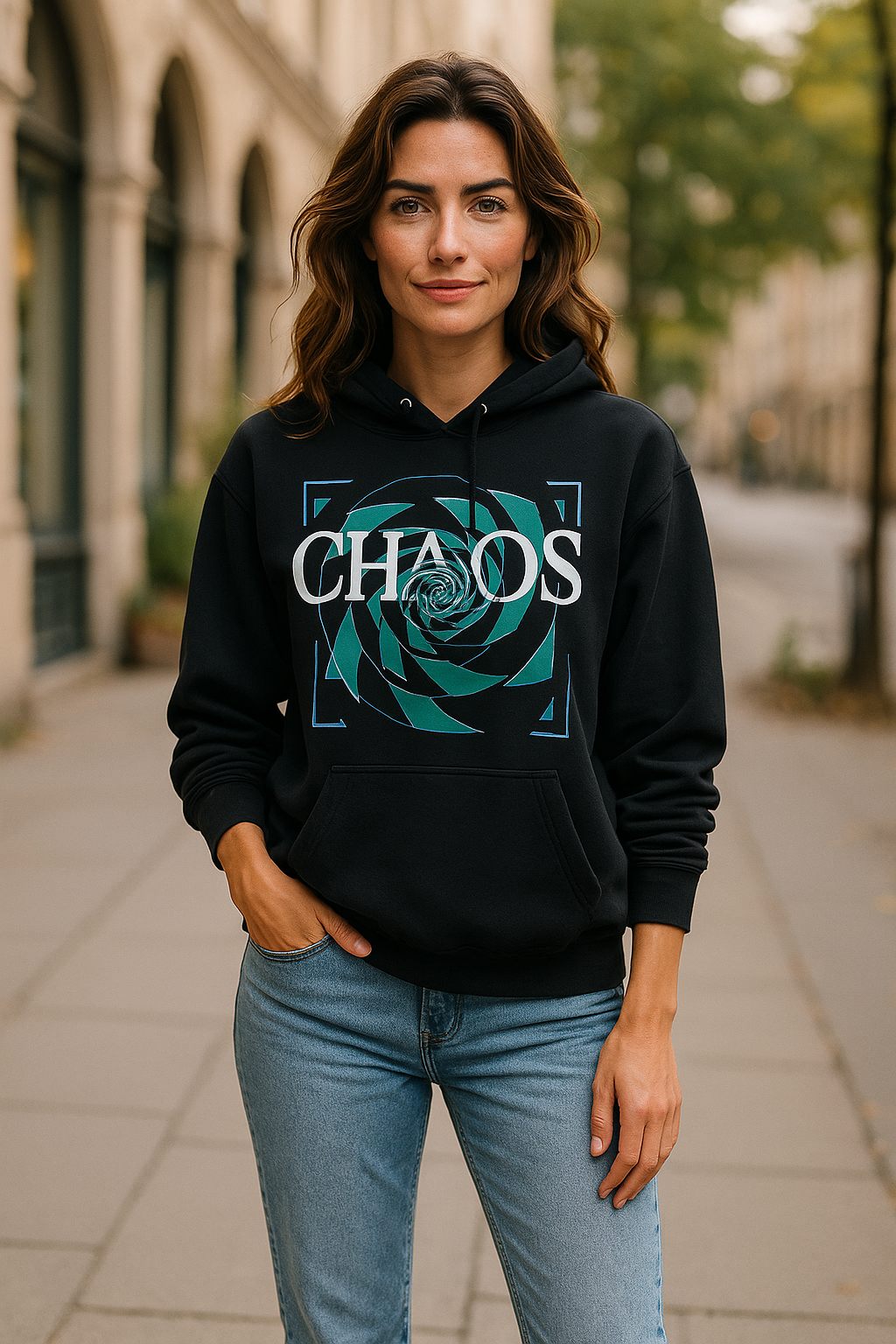Stay cozy and bold in this URBNIDNTY “CHAOS” hoodie, featuring a striking teal spiral graphic and bold typography across the chest. Perfect for casual streetwear styling, this hoodie blends comfort with an edgy aesthetic.